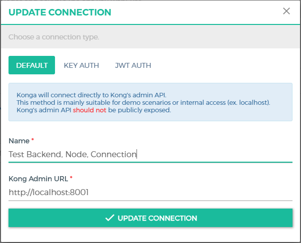 Kong Admin URL은 앞서 설치한 Kong의 Admin URL을 의미하는 것이며 Kong 설정 파일을 변경하지 않았다면